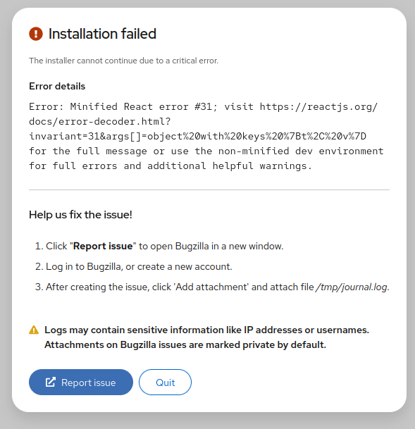 Clicking on āReport issueā and Red Hat web page appears with user id and password to open. It looks like I am required to have Red Hat account or something. I donāt want to go through yet another bug tracker sign in etc. And does our installer issues belongs to Red Hat bug tracker in the first place?
